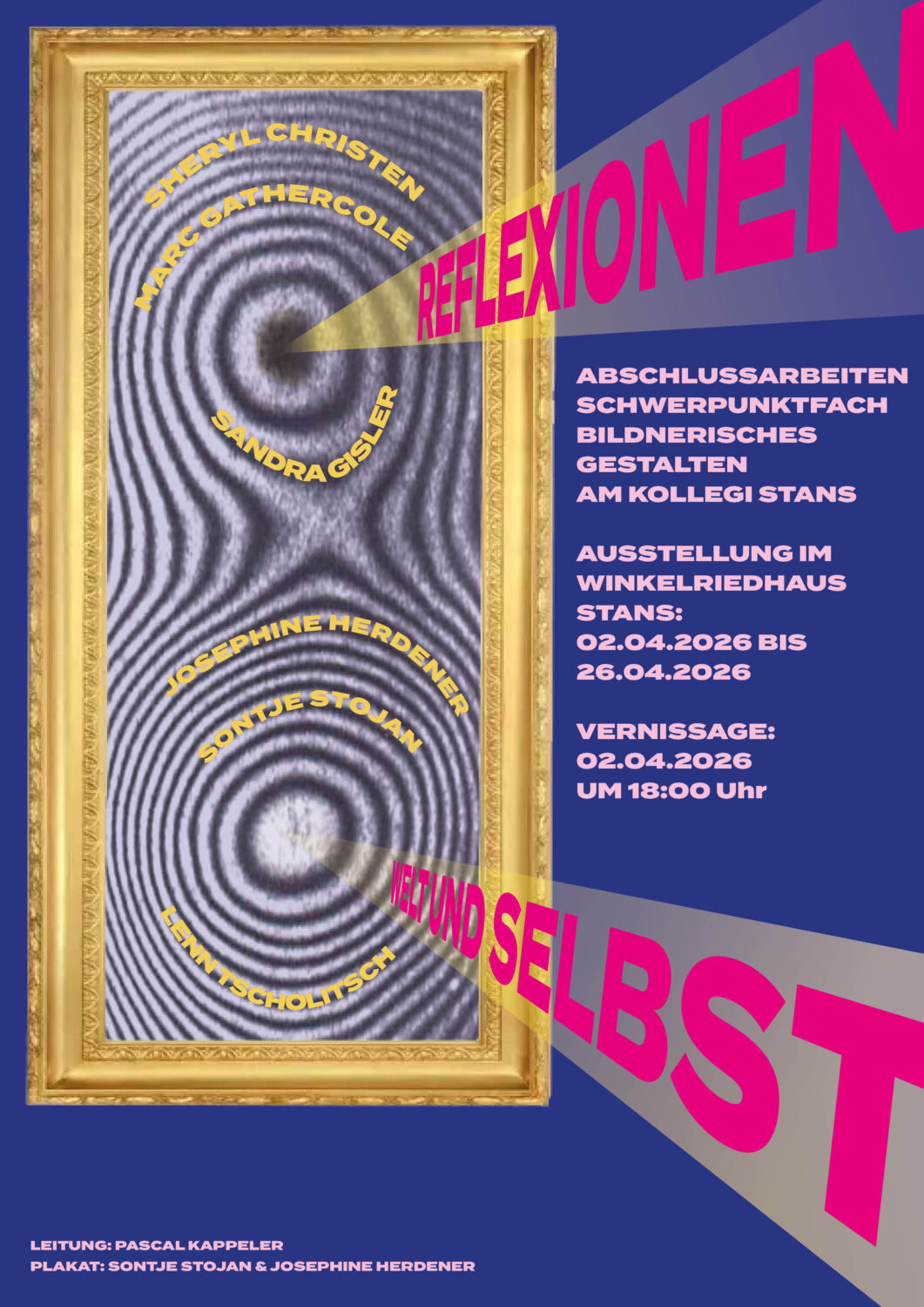 | 2. – 26. April 2026 | Ausstellung der Abschlussarbeiten «Reflexionen», Winkelriedhaus, Stans (bitte Öffnungszeiten des Museums beachten) |