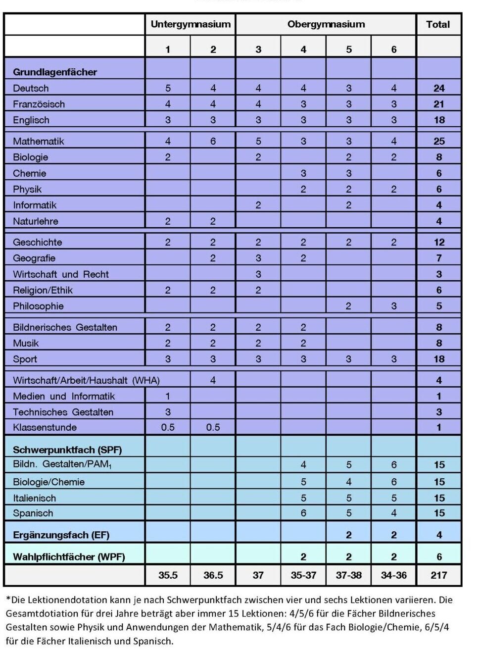 Lektionentafel für die 1. bis 6. Klassen